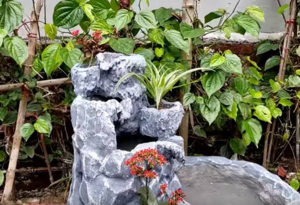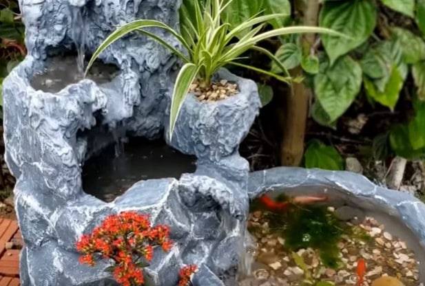 Осталось только покрасить фонтан и установить насосную систему. Для конструкции нужно подготовить ровную площадку на территории садового участка, сделать основание из кирпичей. Сам фонтан можно украсить камнями и цветами.