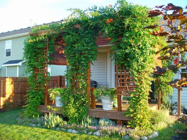 Меняя каркасную конструкцию, Вы можете создавать различные узоры на стене, контролирую направление и густоту разрастания растений. А еще такое озеленение сохраняет прохладу внутри домика в знойный день.