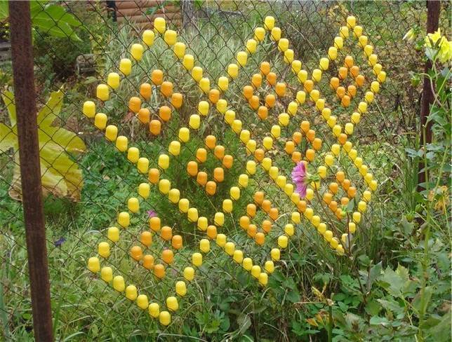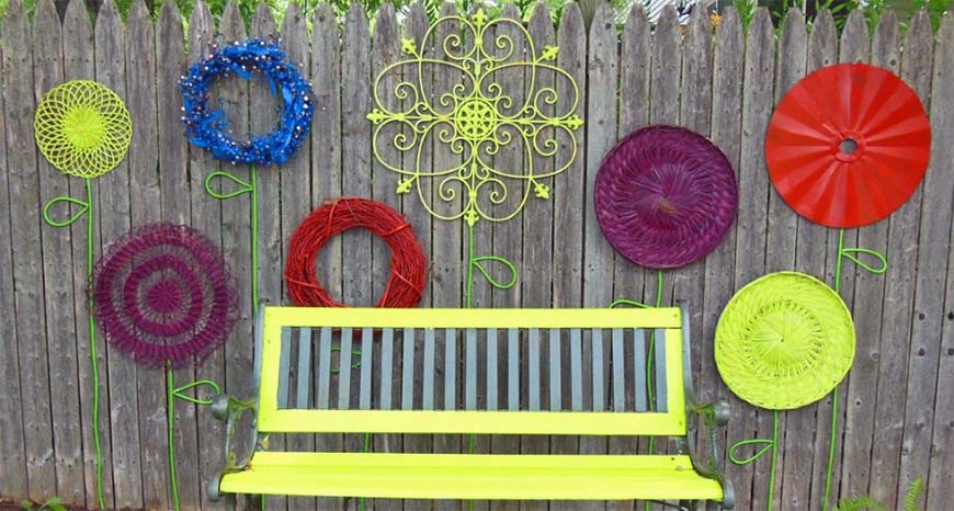Сказочно выглядит декор из сверкающих на солнце дисков, а орнамент из виниловых пластинок навевает воспоминания о детстве. Забор или ограду можно так же оформить цветами, сделанными из одноразовых стаканчиков, ложек или вилок — это настраивает на отдых на природе и созидательный труд.