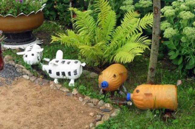 Даже простые бутылки из под различных напитков можно использовать для изготовления фигурок, которые будут красиво смотреться на дачном участке. Для изготовления фигур можно использовать самые разнообразные бутылки и тару предварительно собирая ее в необходимом количестве. Из пластиковых бутылок и другой разнообразной тары можно сделать зверей украшающих участок. Это могут быть лошадки, поросята, коровы и многое другое. Изготавливая различные фигуры из бутылок, можно раскрыть свои таланты и с каждым разом создавать все более совершенные поделки.