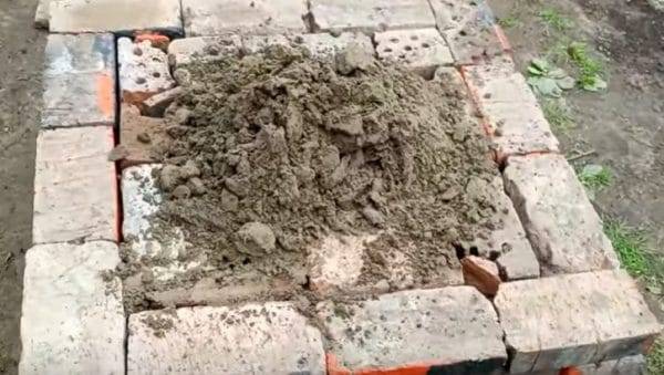 Выбрать и подготовить площадку для мангала. Засыпать песком, выложить кирпичами.