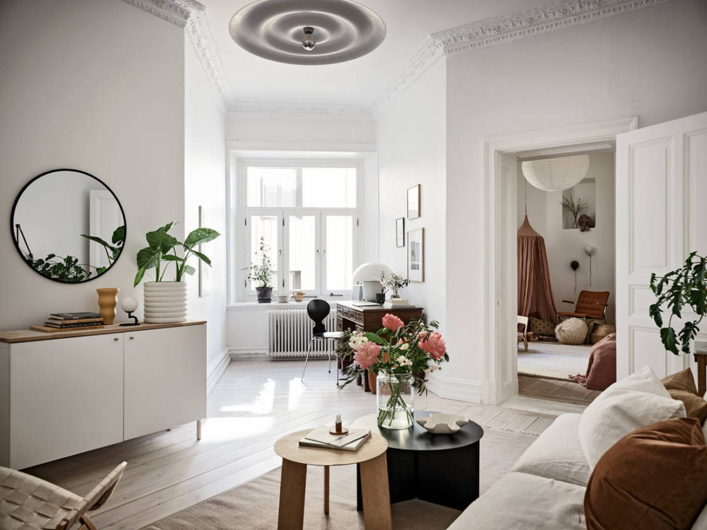 Чтобы оптически увеличить пространство, рекомендуется вешать картины как можно выше. В комнате с двумя окнами на разных стенах установите зеркала. Они визуально удвоят объем помещения и добавят света;