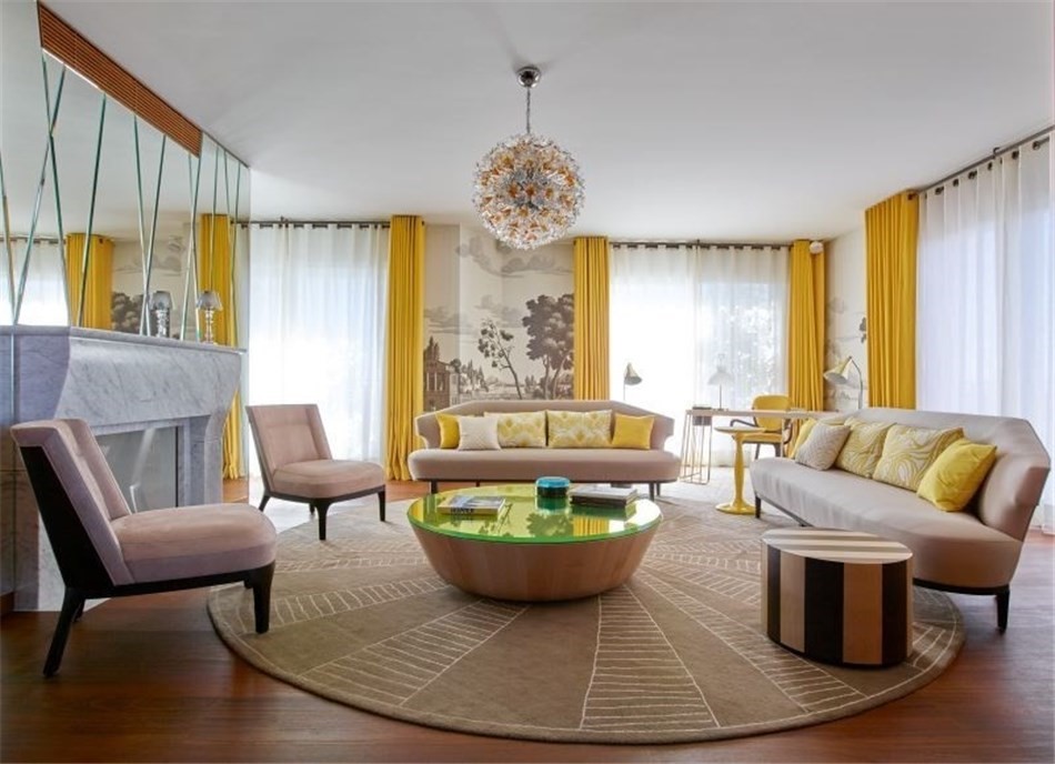 При круговом расположении фокусной точкой является потолочный светильник, стол или ковер. Мебель располагается по кругу от центральной точки. Используйте этот метод, если стена полуовальная, и для больших помещений. Комнаты сбалансированы, учитывается декор или размер элементов.