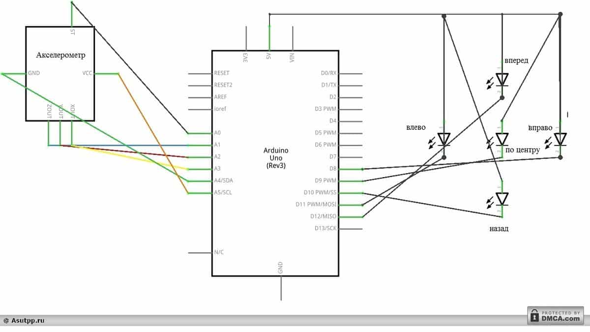 - Восьмой подключается к светодиоду, сигнализирующему о наклоне в правую сторону;