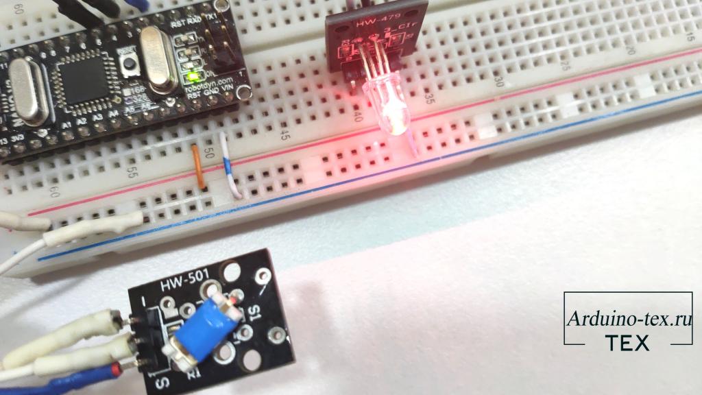 Так как на модуле распаяна вся необходимая обвязка, дополнительные резисторы подключать не нужно. Как мы делали в уроке: KY-017 – модуль ртутного датчика наклона.