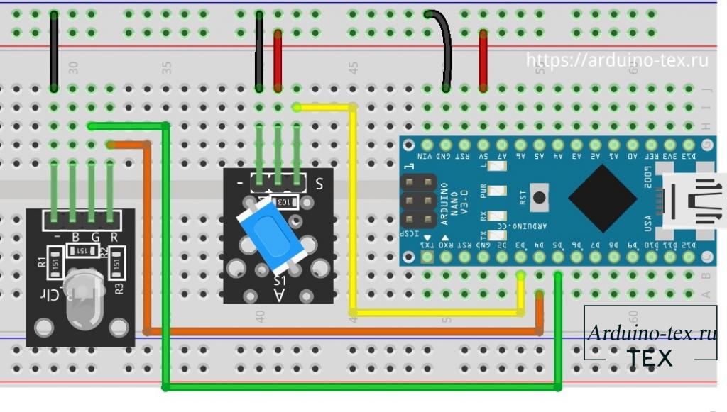 Схема подключения модулей KY-020, KY-016 к Arduino NANO.