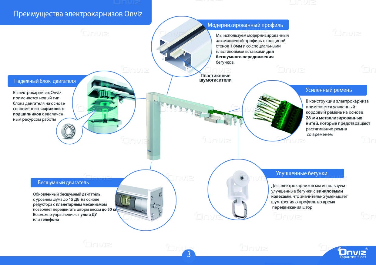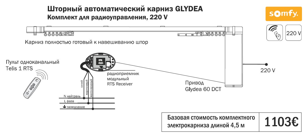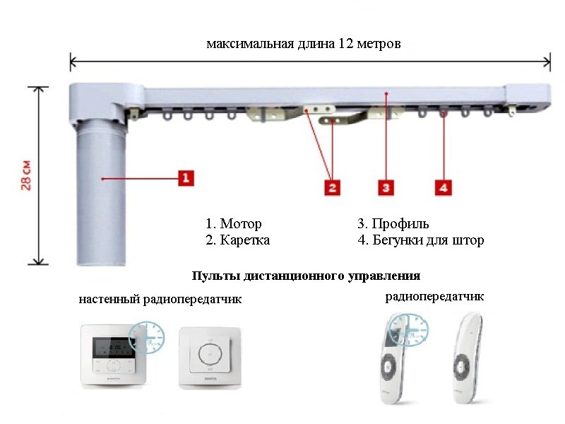 Карниз с электроприводом для возможности дистанционного управления укомплектовывается радио-модулем, который принимает исходящие от пульта сигналы и приводит моторчик в действие.