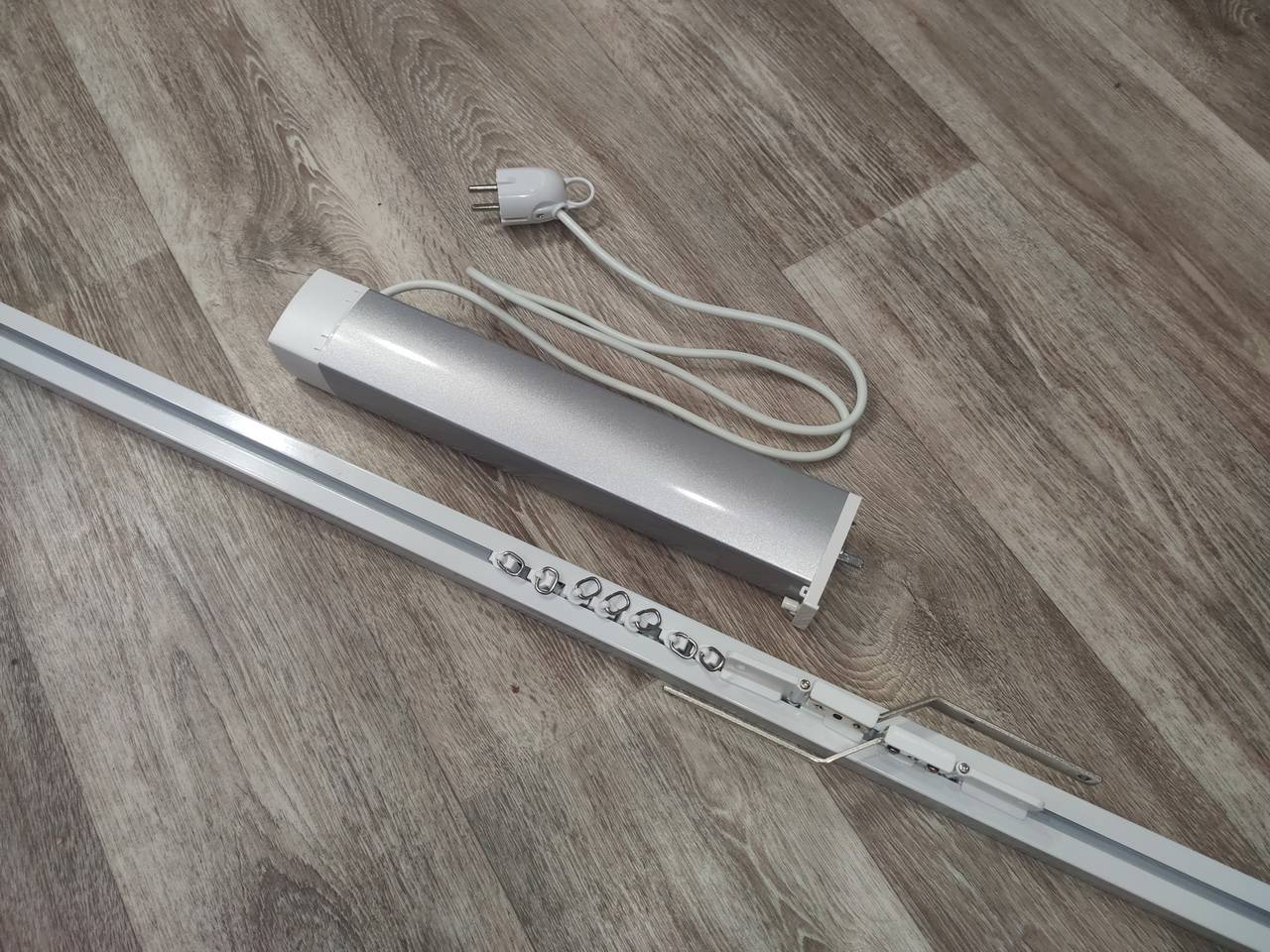 - Электропривод — моторчик, размещенный в цилиндрическом или прямоугольном корпусе, закрепленном на боковой части несущей шины. При активации моторчик стягивает ремень и тот, за счет ограничителя, передвигает фиксирующие занавес бегунки в требуемое положение. Привод работает в двух направлениях, выполняя открытие и закрытие полотен.
