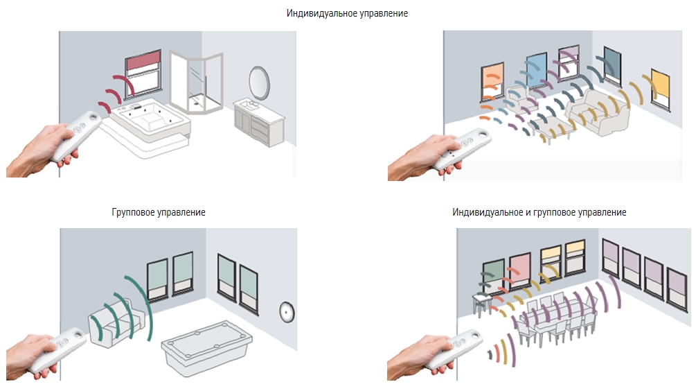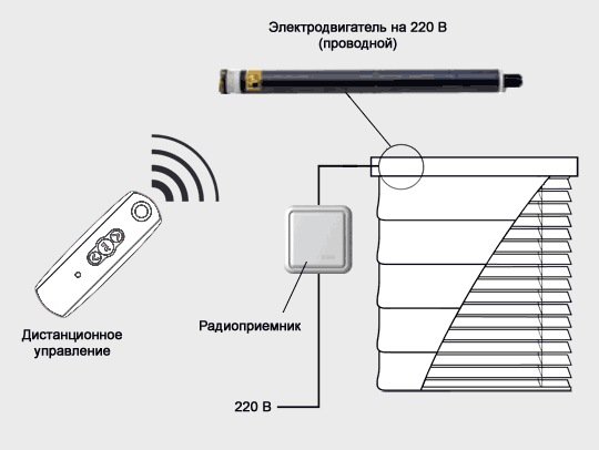 Для дистанционного управления в систему «Умные шторы» кроме ПДУ входит прибор, принимающий управляющие сигналы (инфракрасные или радио). Располагают его в непосредственной близости от электромотора.