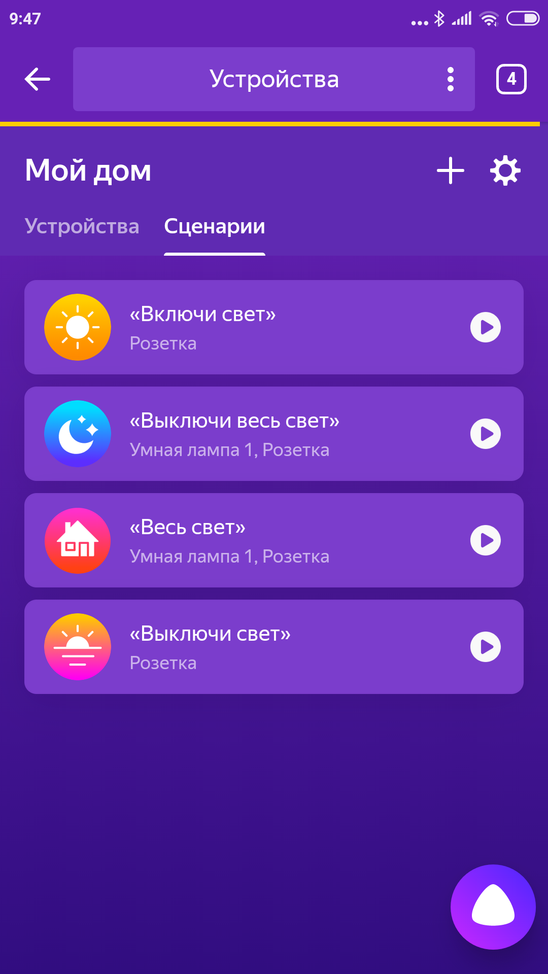 Выше отмечалось, что пользователи могут задавать сценарии. Речь идет об объединении нескольких команд в одну группу и создании определенных сценариев. К примеру, после команды «Алиса, я на работу» отключается розетка, выключается свет и другое оборудование.