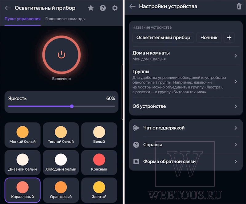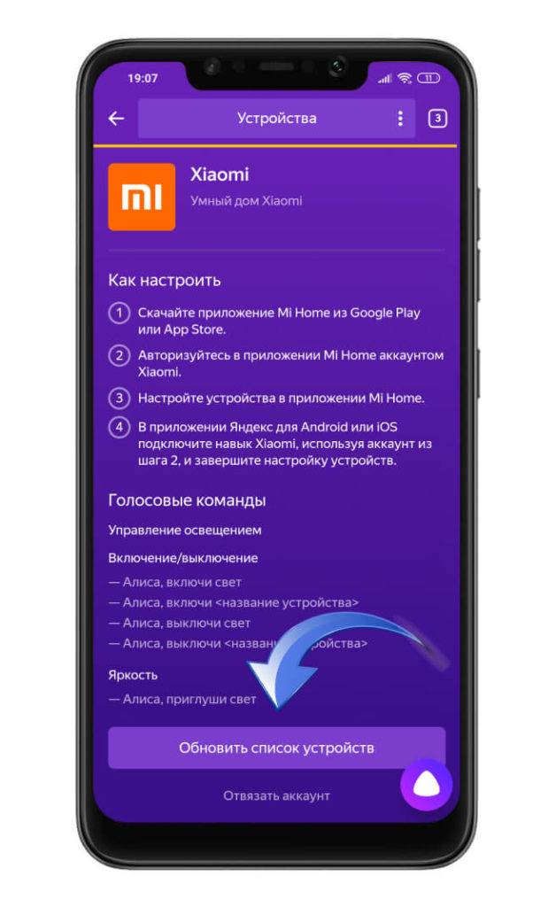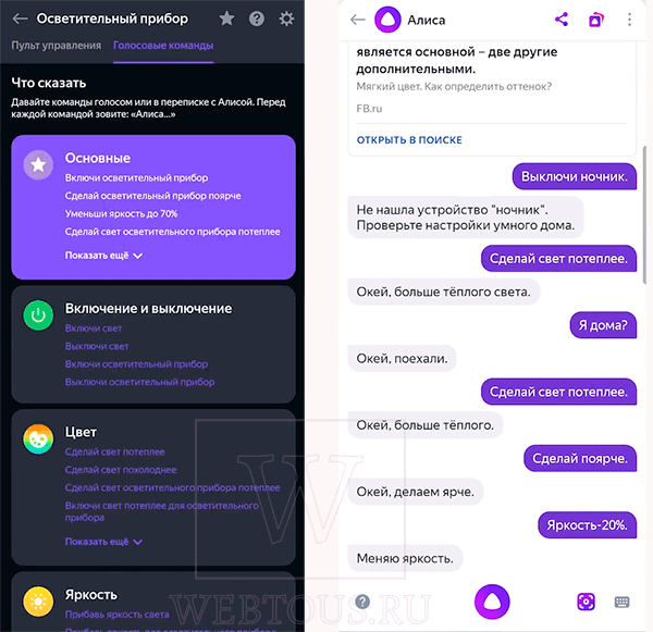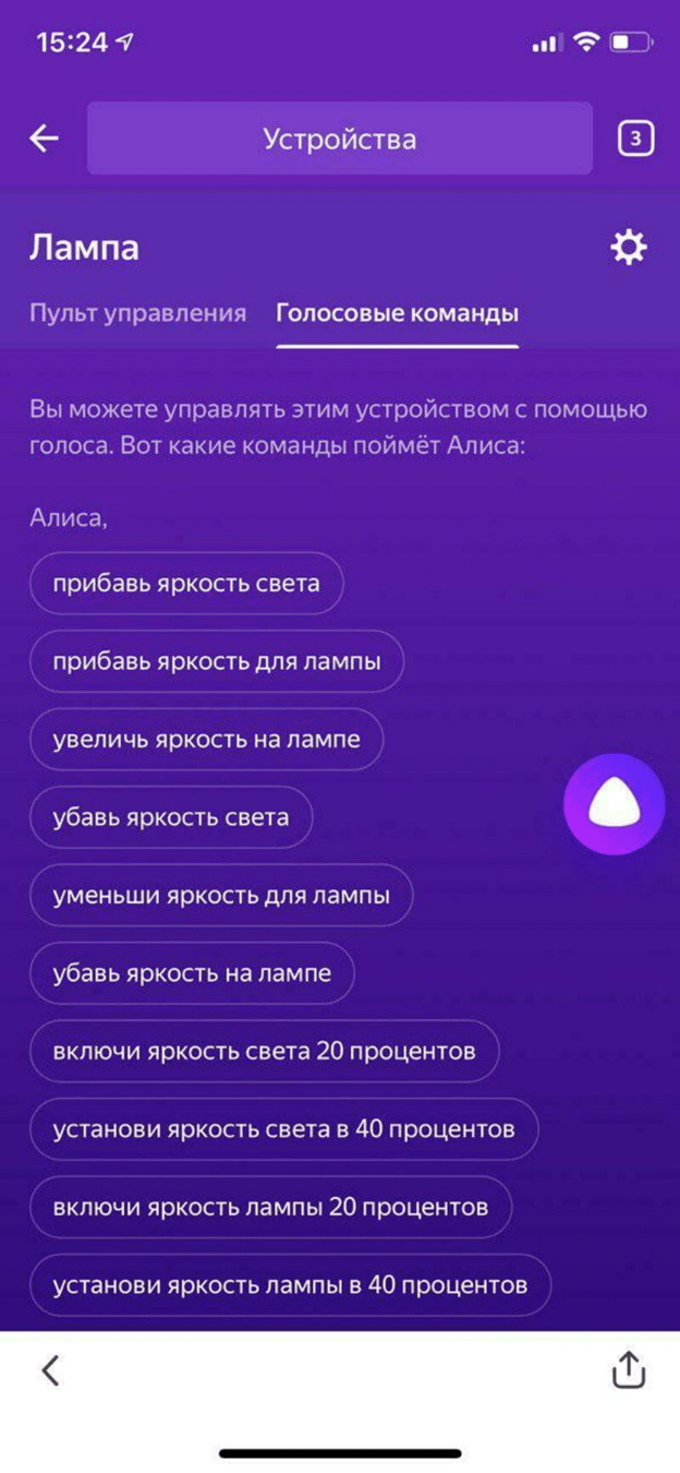 В разделе «Голосовые команды» вы можете посмотреть какие команды голосом понимает Алиса для управления данным устройством. Если речь идет об осветительном приборе, то это будут: включи свет, сделай свет теплее, сделай поярче, назначь яркость 30% и т.п.