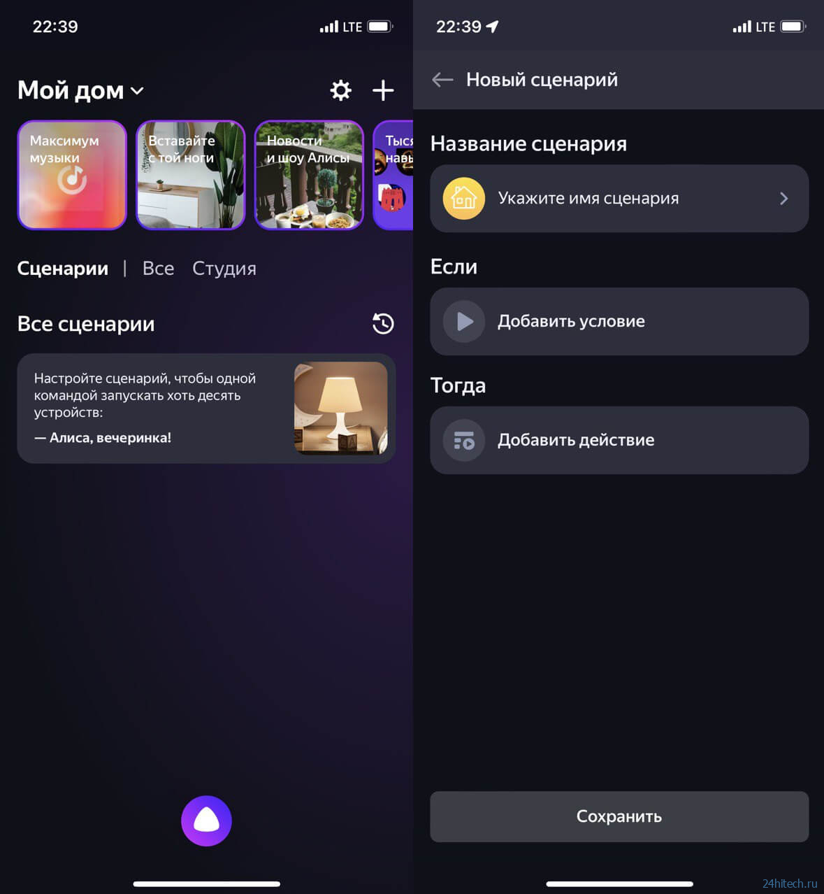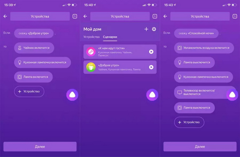 В «Дом с Алисой» можно также создавать целые сценарии действий, которые объединяет между собой несколько умных устройств. Например: