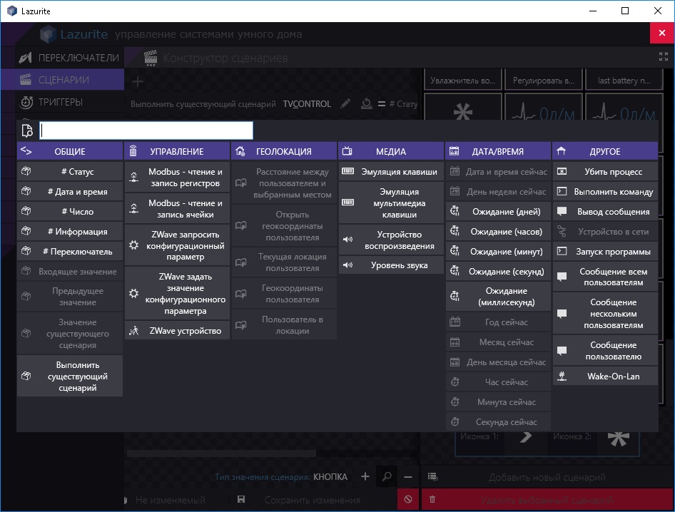 Чтобы настроить сценарий, необходимо придумать его название, выбрать группу управляемых приборов и задать их действие. Труднее всего — разработать правильные алгоритмы применительно к разным жизненным ситуациям.