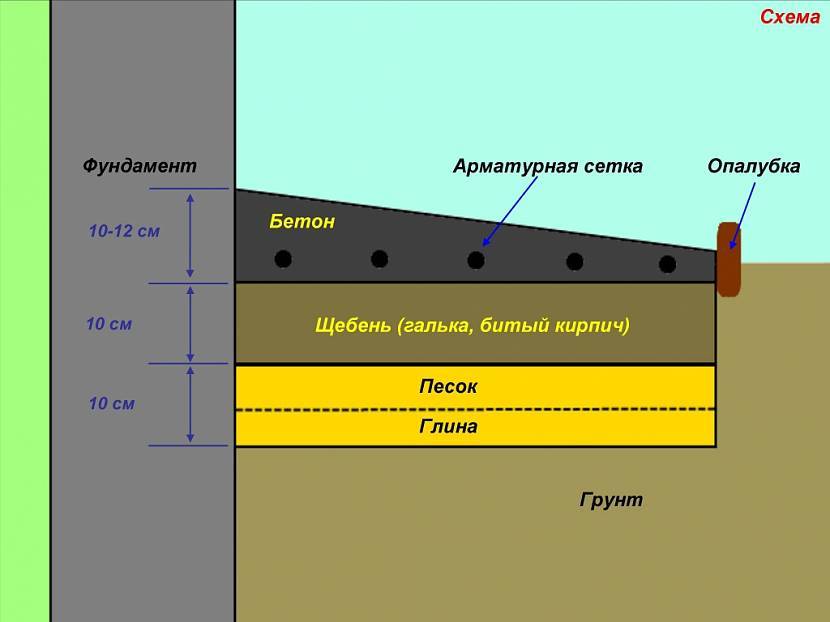 Схема слоёв отмостки вокруг домаИсточник vodakanazer.ru