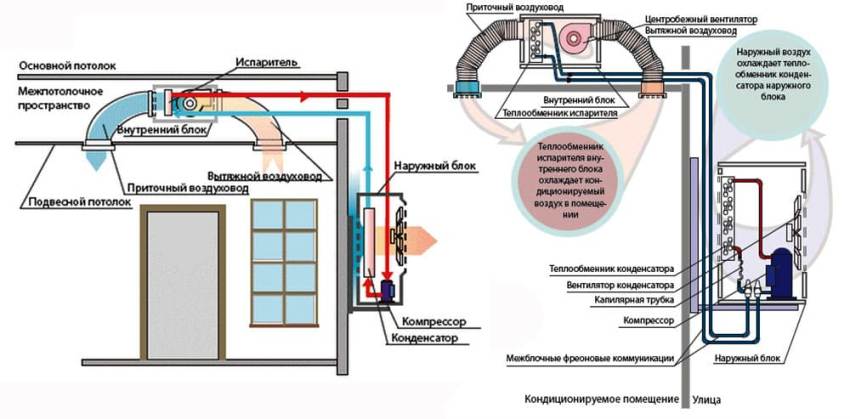 Хотя разъединительная система состоит из внутреннего и внешнего модулей, по принципу работы она не отличается от действия бытового потолочного кондиционера любого другого типа.