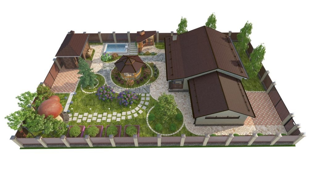 Зонирование должно быть грамотным. Проще делить участок на секции, когда он прямоугольный. При круглой планировке углы скругляют посредством цветников, кустарников, искусственных сооружений.