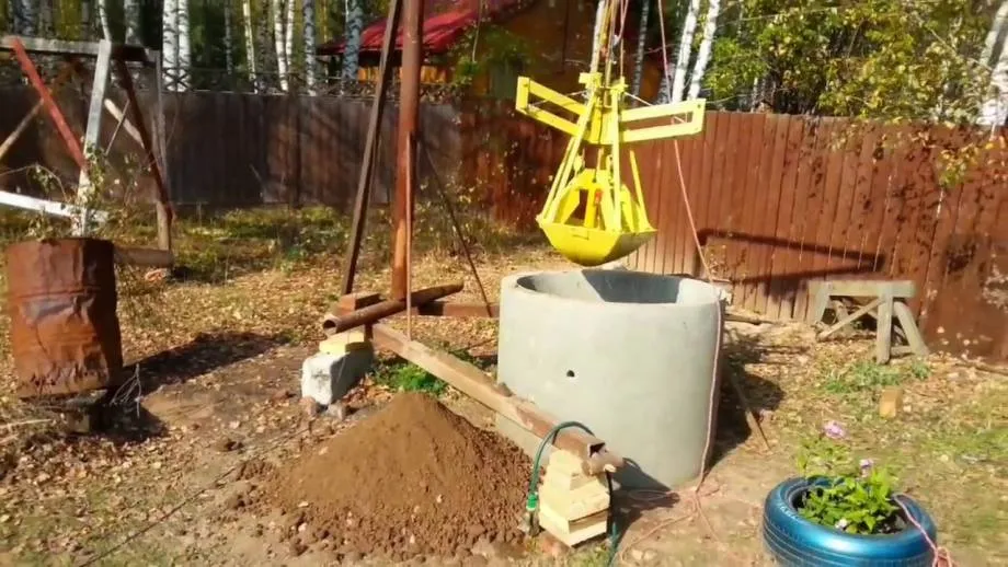 Осадка колец при помощи груза. Шахта подкапывается, после чего кольца осаживаются при помощи тяжелой техники. Метод подходит только для нового колодца, которому не более 2 месяцев. Минусы: можно раздавить верхние кольца; в старом, слежавшемся грунте может произойти разрыв ствола.