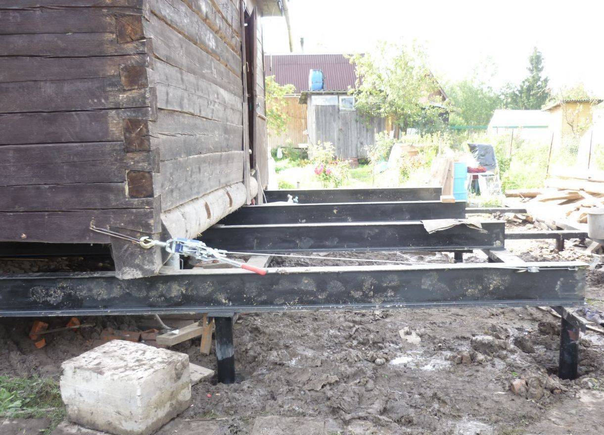 4. Теперь под балки заводим новый толстый брус, который будет опираться на землю через металлические трубы.
