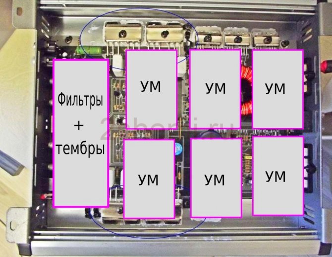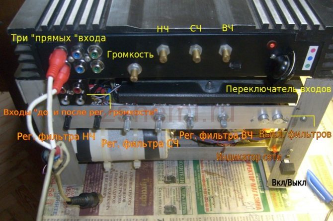 С выхода каждого канала фильтра сигналы ВЧ-СЧ-НЧ подаются на входы усилителй мощности, которые, также, можно собрать по любой из известных схем в зависимости от необходимой мощности всего усилителя. Я делал УМЗЧ по известной давно схеме из журнала «Радио», №3, 1991 г., стр.51. Здесь даю ссылку на «первоисточник», так как по поводу этой схемы существует много мнений и споров по повод её «качественности». Дело в том, что на первый взгляд это схема усилителя класса «B» с неизбежным присутствием искажений типа «ступенька», но это не так. В схеме применено токовое управление транзисторами выходного каскада, что позволяет избавиться от этих недостатков при обычном, стандартном включении. При этом схема очень простая, не критична к применяемым деталям и даже транзисторы не требует особого предварительного подбора по параметрам К тому же схема удобна тем, что мощные выходные транзисторы можно ставить на один теплоотвод попарно без изолирующих прокладок, так как выводы коллекторов соединены в точке «выхода», что очень упрощает монтаж усилителя: