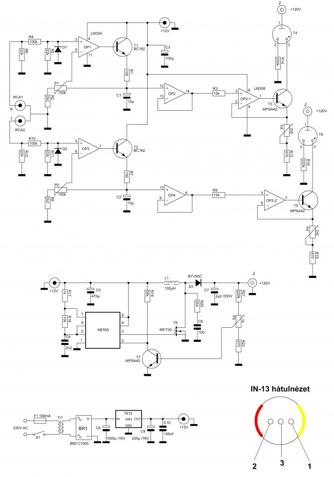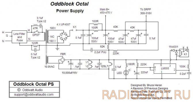 Питание поступает на УНЧ через разъем, расположенный на задней панели усилителя. На входе 220 В есть 3 ампер предохранитель и фильтр помех. Силовой трансформатор Edcor с выходными обмотками 180V-0-180 В в 250 мА и 12 В на 4 А. Питание 12V постоянного тока используется для накалов ламп. Схема на LM555 и реле, используется для задержки подачи питания анодов.
