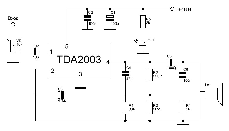 Заслуженной популярностью у любителей звукотехники пользуется микросхема TDA2003 (К174УН14). На ней можно собрать несложный УНЧ с неплохими характеристиками. На нагрузке 4 Ома такой аппарат может выдать до 5 ватт нагрузки. Схема требует однополярного питания, напряжение которого можно варьировать в пределах 8..18 вольт. С увеличением напряжения растет и мощность, но надо следить, чтобы оксидные конденсаторы выдерживали такое напряжение. Они должны быть рассчитаны на уровень БП с хотя бы небольшим запасом.