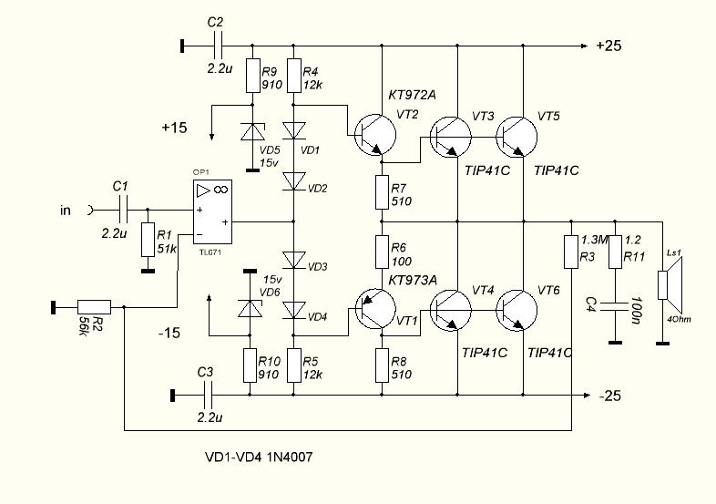 Схема мощного гитарного усилителя на транзисторах TIP142 и TIP147 (60Вт)
