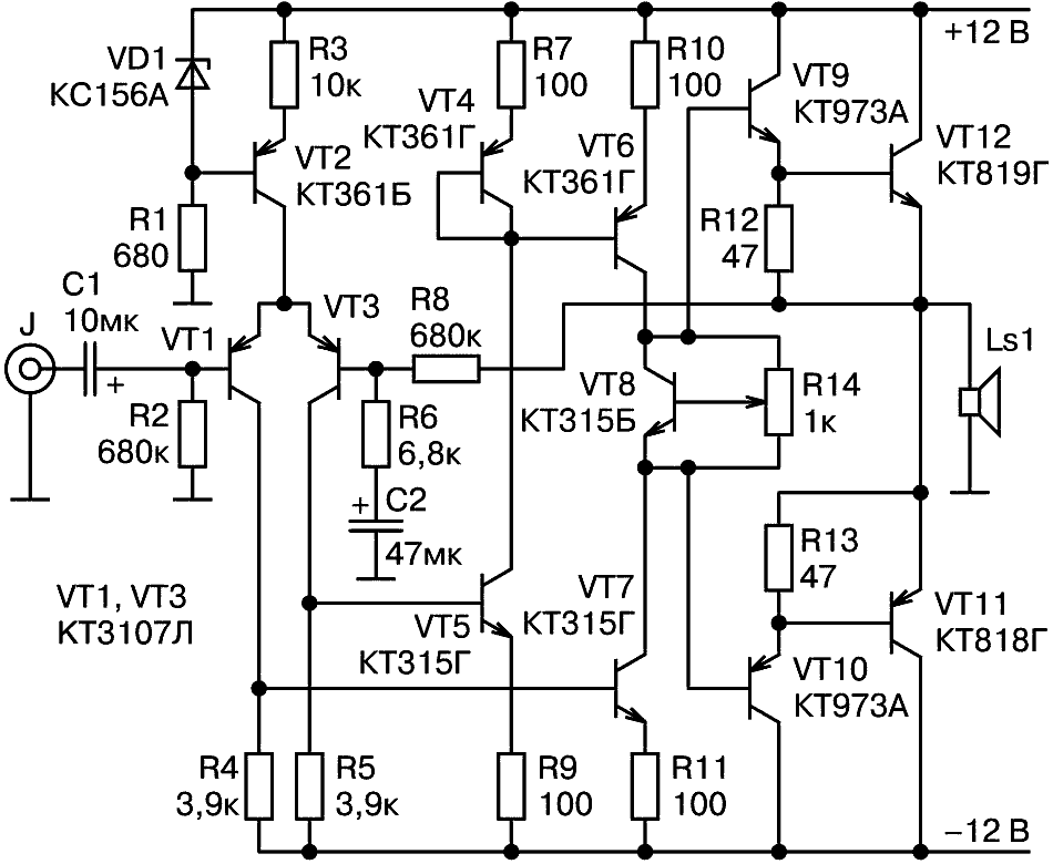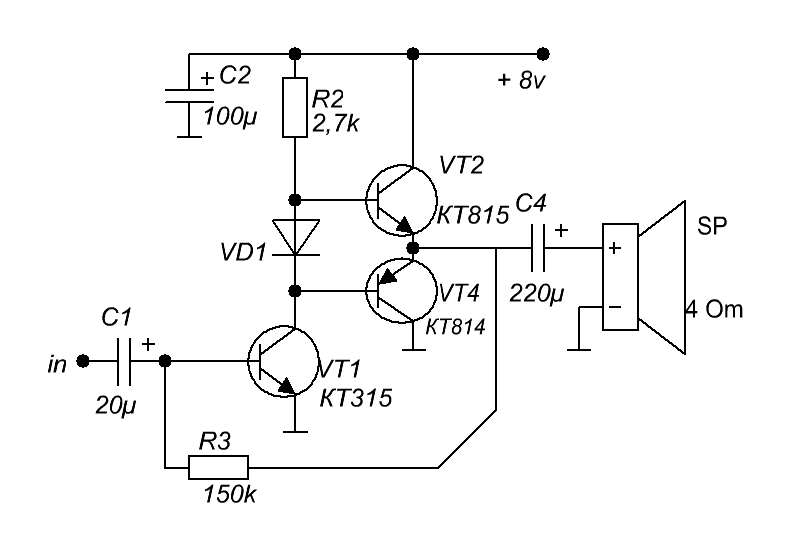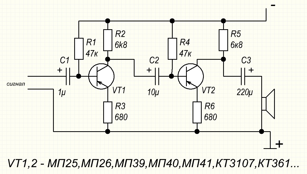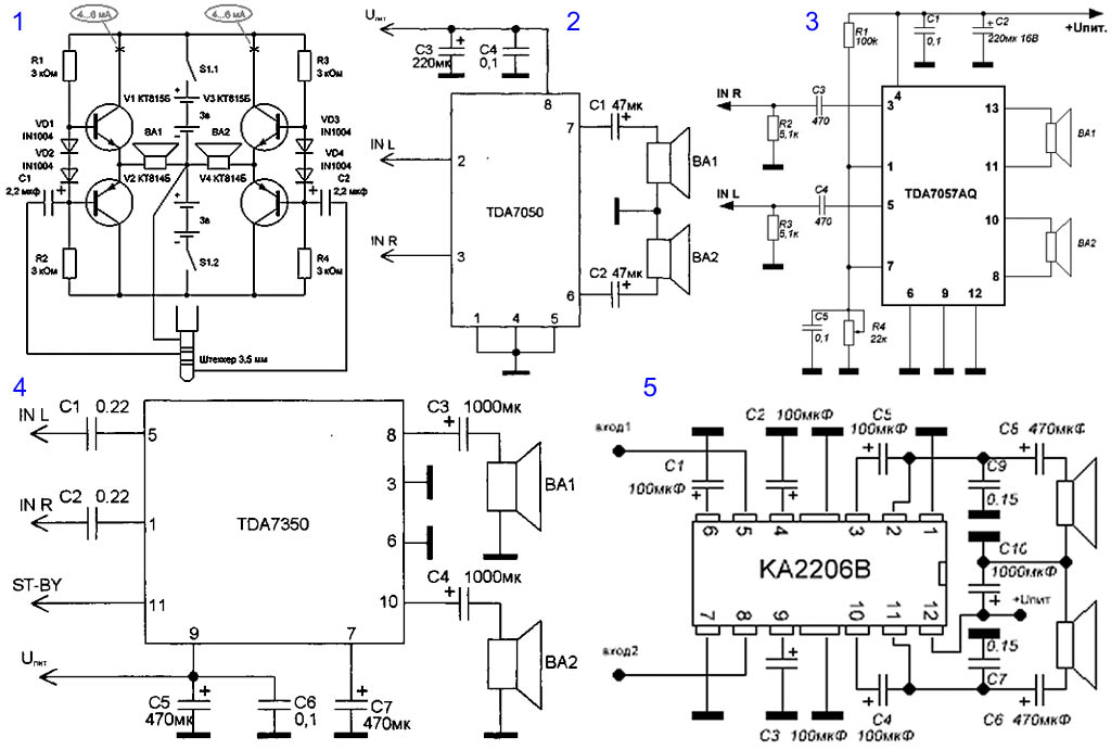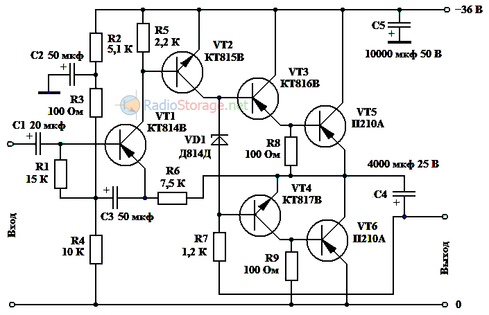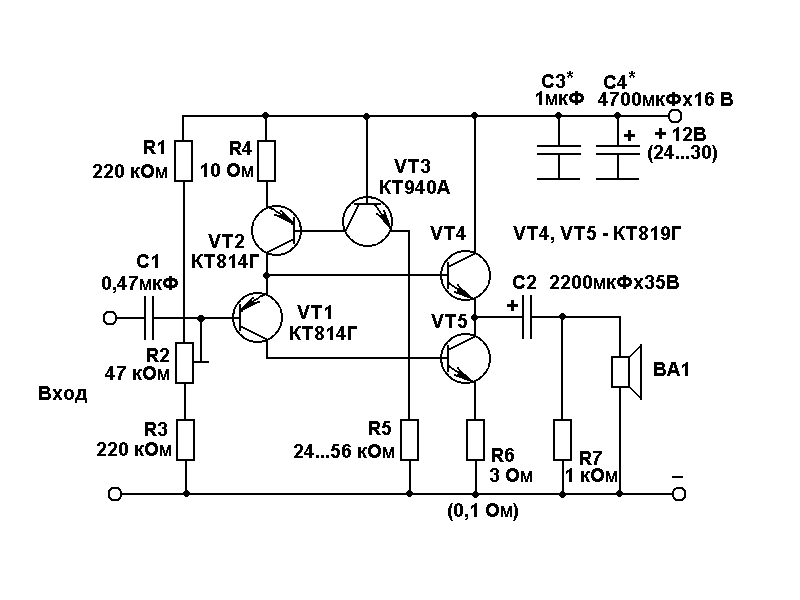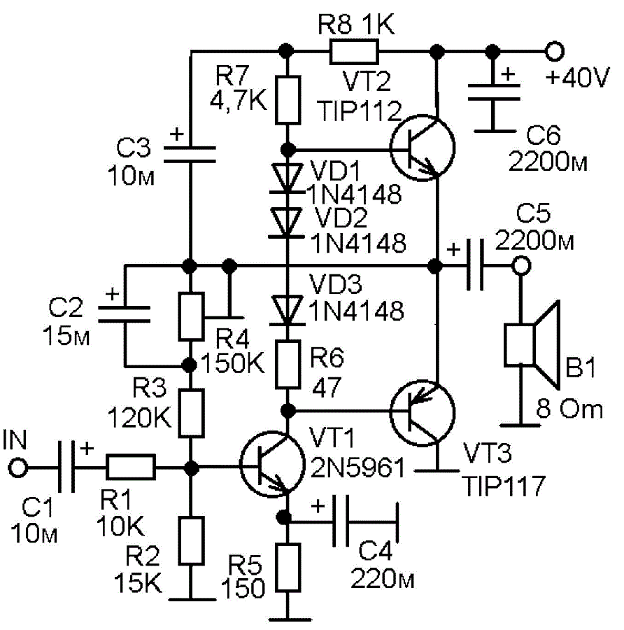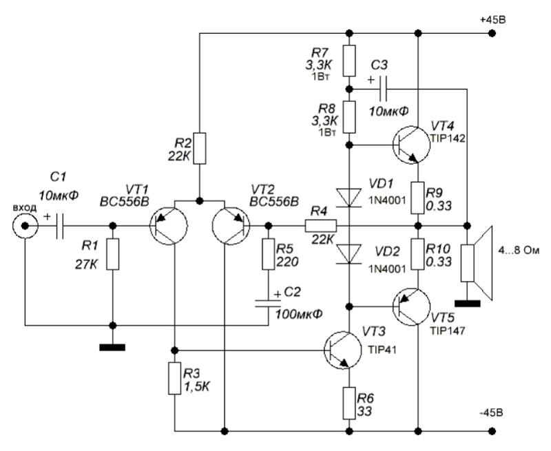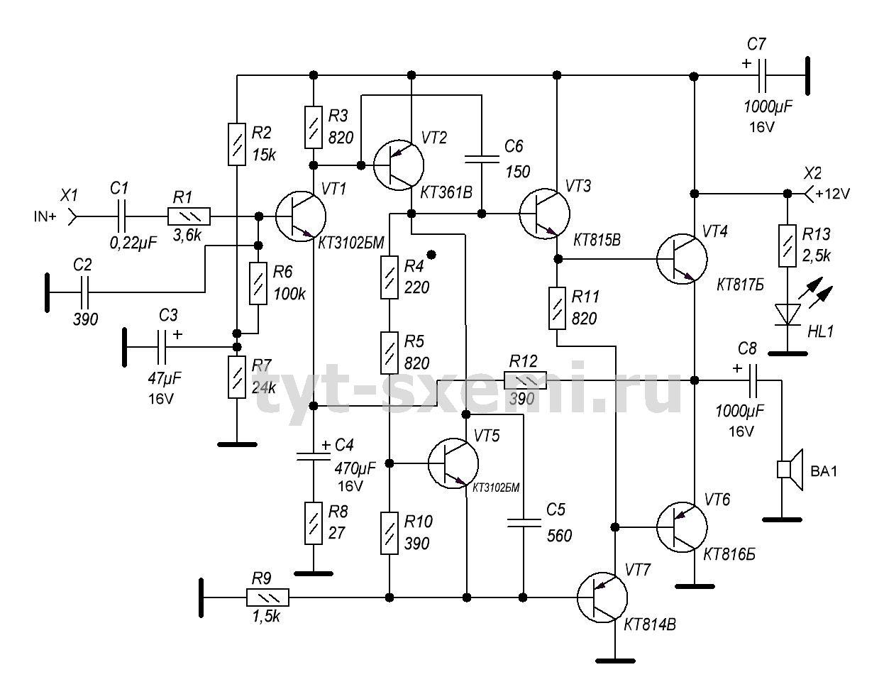 Здесь вы найдете схемы транзисторных усилителей разной сложности и с разным классом мощности:
