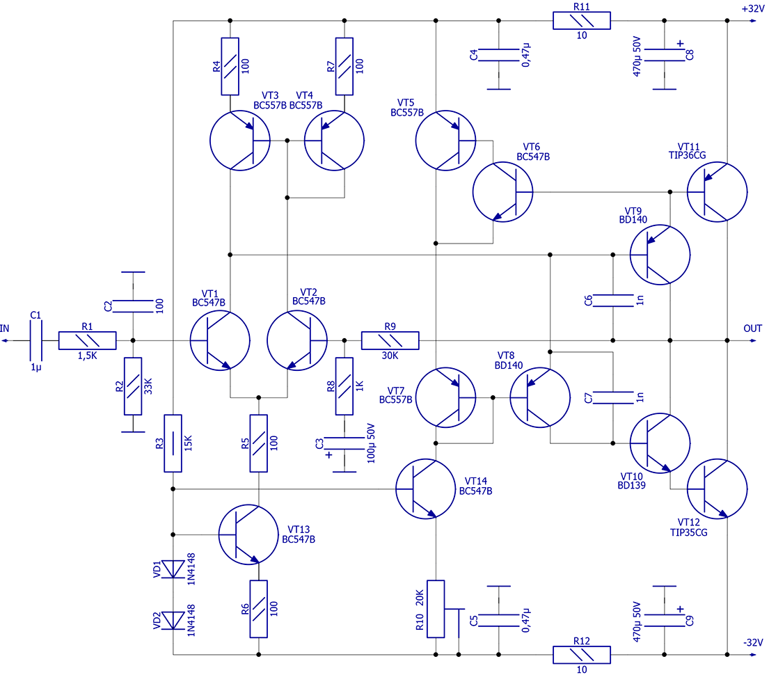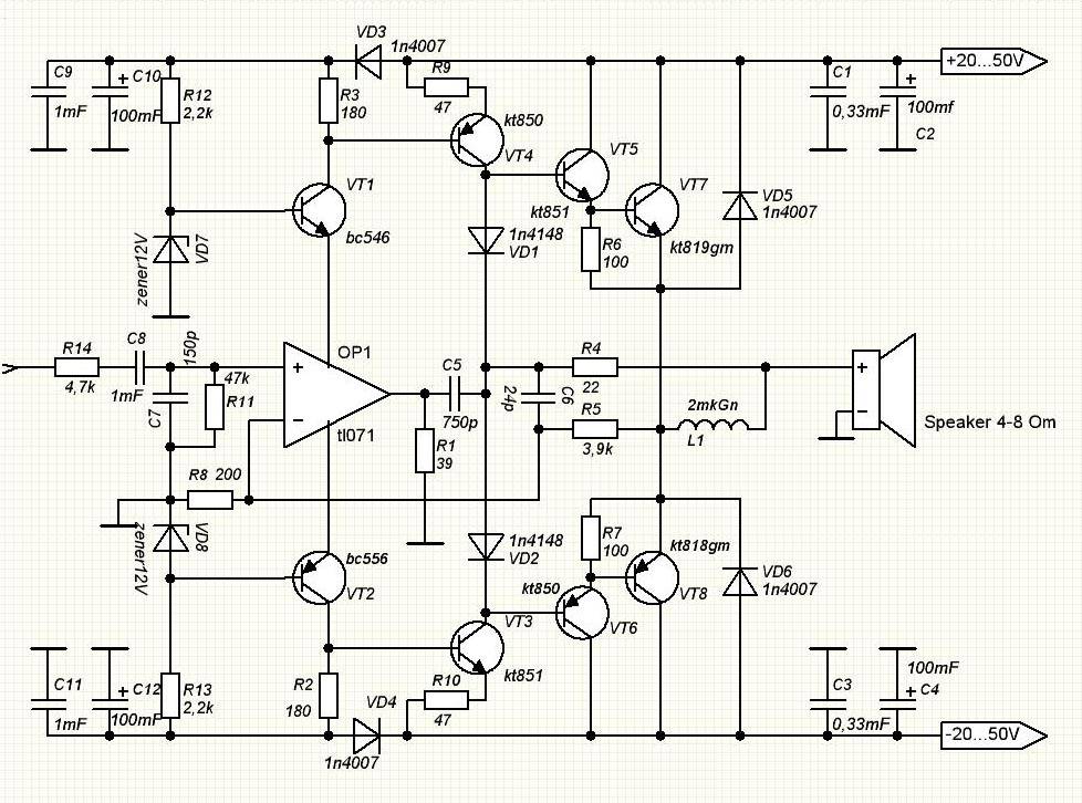 При настройке лишь ВАЖНО подобрать правильные режимы работы транзисторов предоконечного каскада (подбором резисторов R7R8) — на базах этих транзисторов в режиме «покоя» и без нагрузки на выходе (динамика) должно быть напряжение в пределах 0,4-0,6 вольт. Напряжение питания для таких усилителей (их, соответственно, должно быть 6 штук) поднял до 32 вольт с заменой выходных транзисторов на 2SA1943 и 2SC5200, сопротивление резисторов R10R12 при этом следует также увеличить до 1,5 кОм (для «облегчения жизни» стабилитронам в цепи питания входных ОУ). ОУ также были заменены на ВА4558, при этом становится не нужна цепь «установки нуля» (выходы 2 и 6 на схеме) и, соответственно меняется цоколёвка при пайке микросхемы