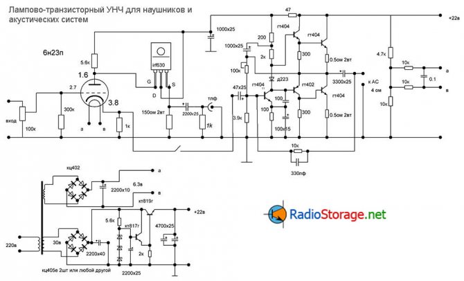 Эта схема предлагается многим радиолюбителями как ламповый усилитель для наушников. В последствии оказалось очень удобно иметь ламповый усилитель НЧ для наушников и на акустику — построенный на транзисторах. Схема в особом описании не нуждается, при правильной сборке все начинает работать сразу. Для удобства мною была поставлена кнопка на две пары контактов для отключения транзисторной части от ламповой, что в свою очередь избавило от необходимости отключать колонки от усилителя при использовании наушников. Но при желании можно одновременно слушать и ухи и колонки — кому как нравится.