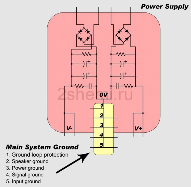 Основное заземление должно быть расположено как можно ближе к ёмким конденсаторам на источнике питания: