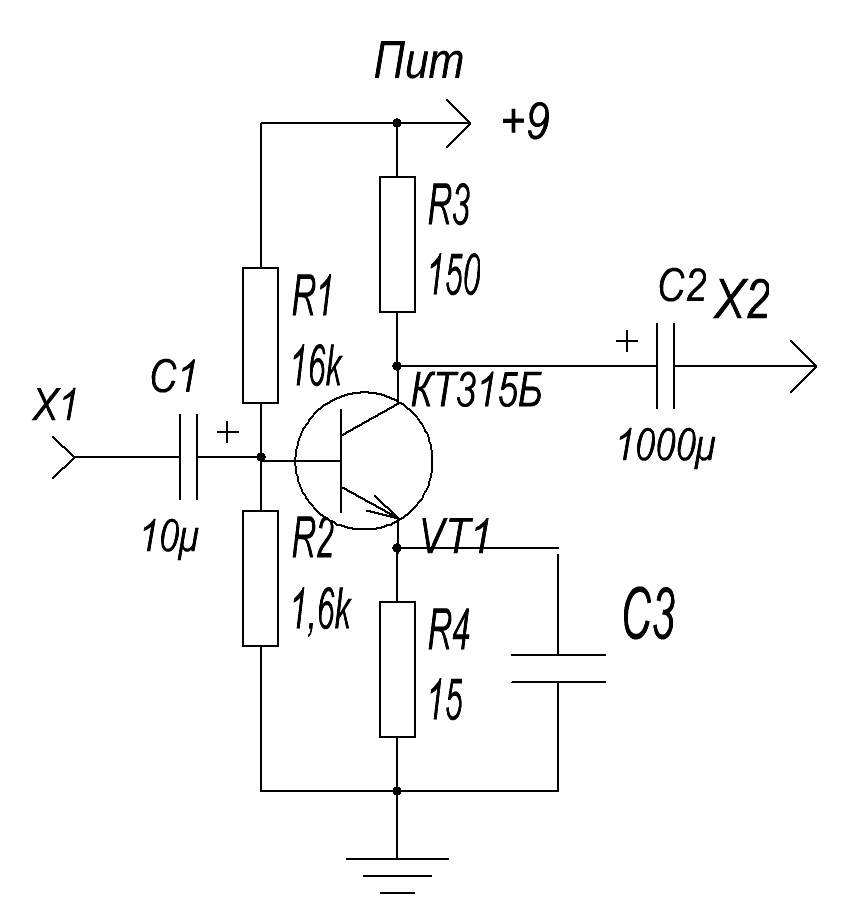 Рис. 1. Схема простого УНЧ на одном транзисторе + конденсатор и резистор.