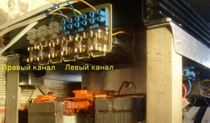 Вид сзади, с колодками выходов на динамики и блоком предохранителей (поскольку никакие схемы электронной защиты не делались из-за недостатка места в конструкции и чтобы не усложнять схему):