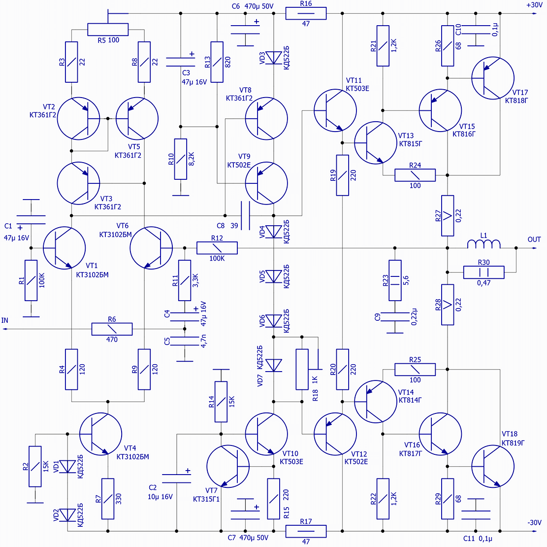 Транзисторные усилители мощности низкой частоты (УМЗЧ) для звуковой и аудио-аппаратуры. В разделе собраны принципиальные схемы самодельных усилителей мощности НЧ на биполярных и полевых транзисторах.
