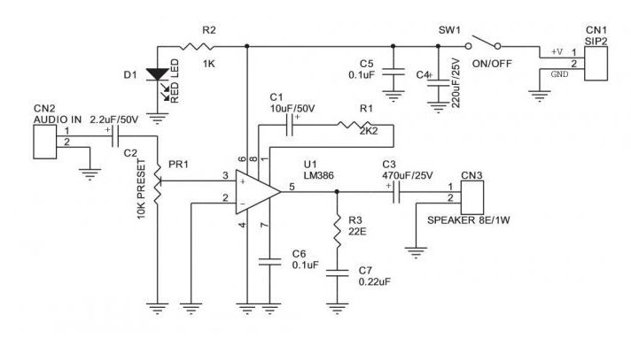 Простой УНЧ можно собрать на микросхеме LM386. Обычно, из нее делают усилители низкой частоты для приемной аппаратуры или небольших плейеров, но она подойдет и для других целей.