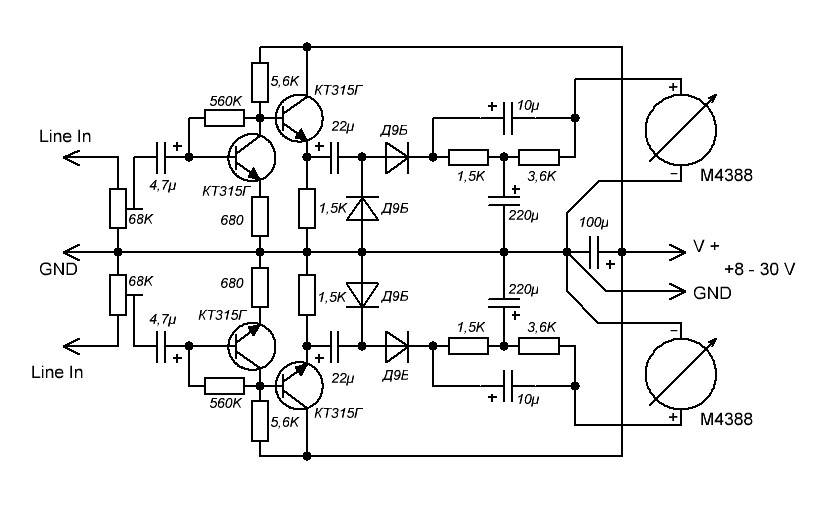 Что получается? После включения усилителя первые 30 секунд греются накалы, потом в течение примерно 45с плавно нарастает анодное напряжение, а затем включается индикатор уровня сигнала на передней панели, сигнализируя о готовности усилителя к работе. Оба реле после всех манипуляций остаются в отпущенном состоянии. Кстати, об индикаторе. Его схема вот такая.