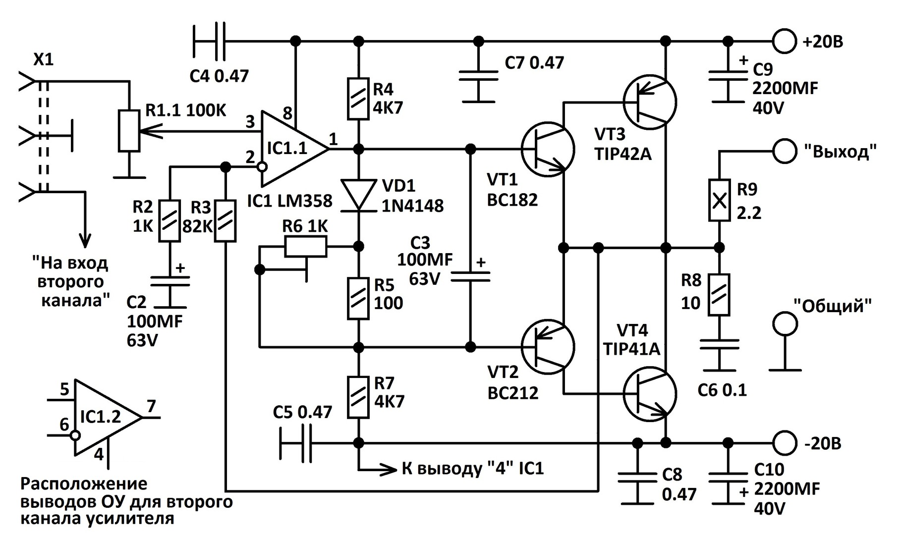 Проще сделать усилитель, имея под рукой готовую схему. Стоит учитывать, что количество и расположение ножек на разных устройствах отличается. На бумаге они обозначены пронумерованными точками по периметру квадрата, представляющего микросхему.