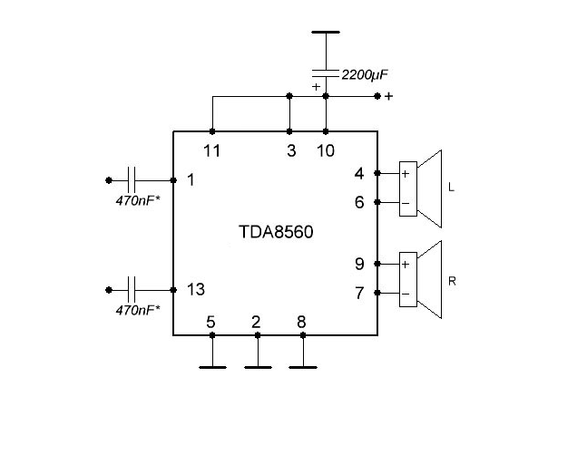 Этот стереофонический усилитель при однополярном питании 12 вольт и минимальной обвязке может выдать мощность до 40 ватт (на нагрузке 2 Ома)! Такой уровень питающего напряжения делает удобным применение схемы в составе автомобильной акустической системы.