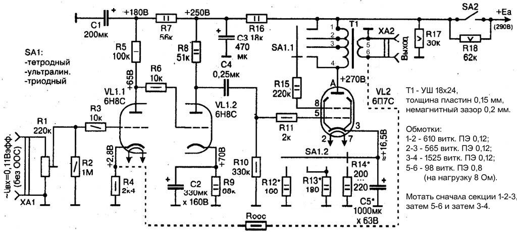 Самый простой ламповый усилитель собирается на советских лампах типа 6ж«Х», где Х — цифра от 1 до 12. В зависимости от конкретной цифры, меняется звучание готового устройства и некоторые условия настройки, не критичные для готового изделия.