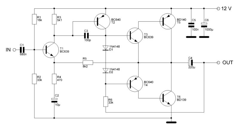 УНЧ на 6 транзисторах питается от источника постоянного напряжение 12 вольт и развивает на нагрузке 4..6 Ом мощность до 3 ватт, что вполне достаточно для озвучивания небольшого помещения. Транзисторы выходного каскада T5 и T6 надо установить на небольшом радиаторе. Эту пару можно заменить отечественными элементами КТ814 и КТ815.