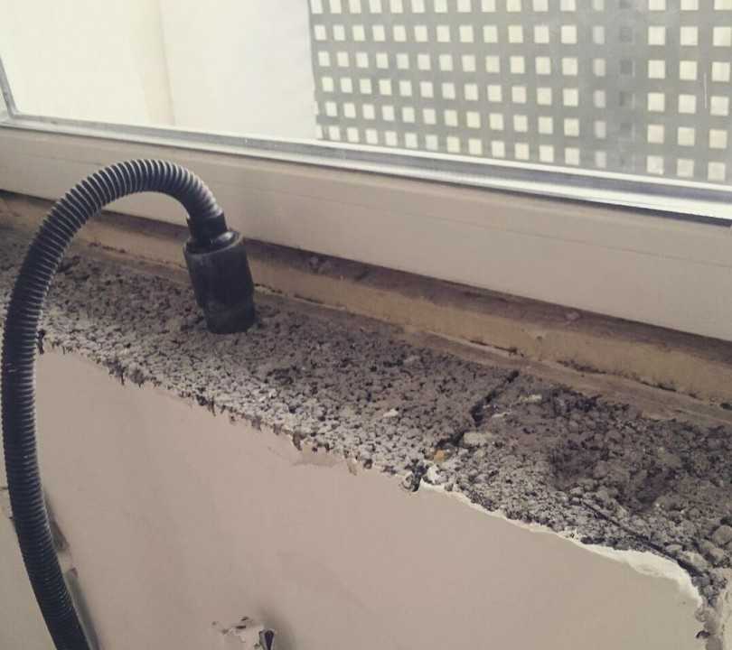 На очищенную стену наносится грунтовка и вода. Если под основанием есть углубление, в котором проходят коммуникации, то сверху него укладываются горизонтальные опоры из металла или дерева для удержания подоконника.