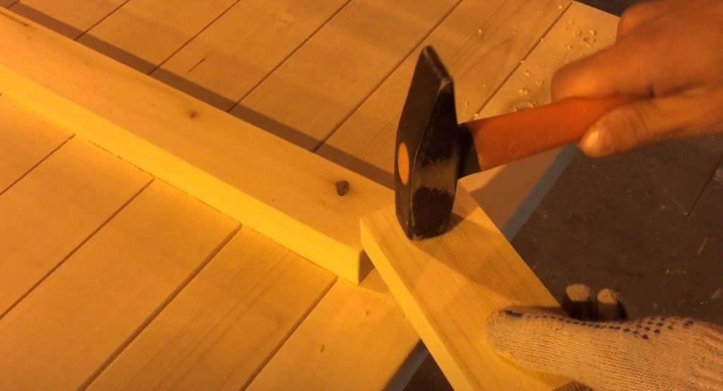 - Сборка изделия. Собираете дверь (лучше — с использованием клея) и проверяете правильность сборки и сопоставимость (диагональ, плотность). Есть рекомендации дополнительно укреплять конструкцию вверху и внизу поперечными досками, по бокам — брусьями.