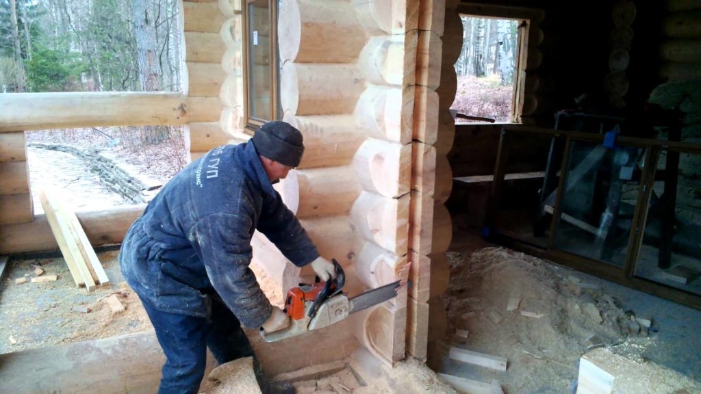 Но, если установку производят в сруб, тогда надо выпиливать проем. При этом идет ослабление связи между бревнами. Здание со сруба дает усадку, поэтому проем надо делать большой для блока. Запасом идет не меньше 10 см.