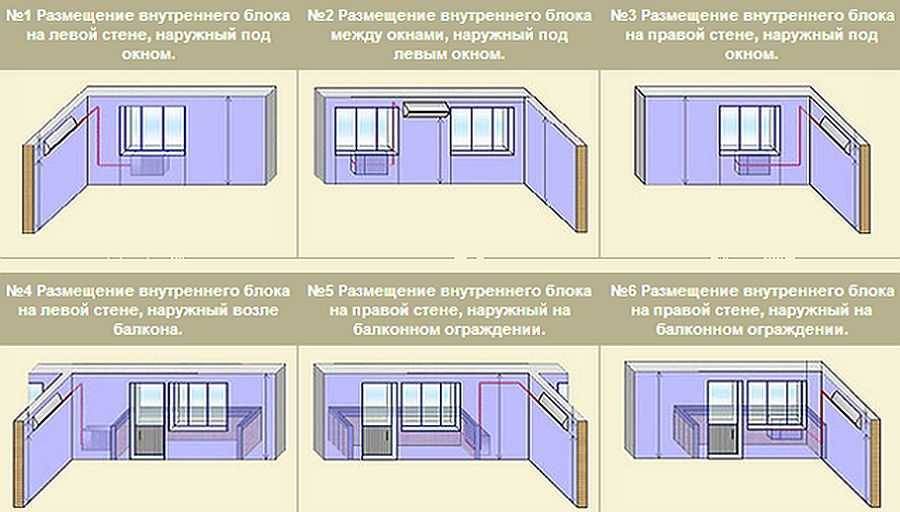 Подходящая схема для монтажа нового кондиционера зависит от типа блока. Внутренний модуль допускается вешать: