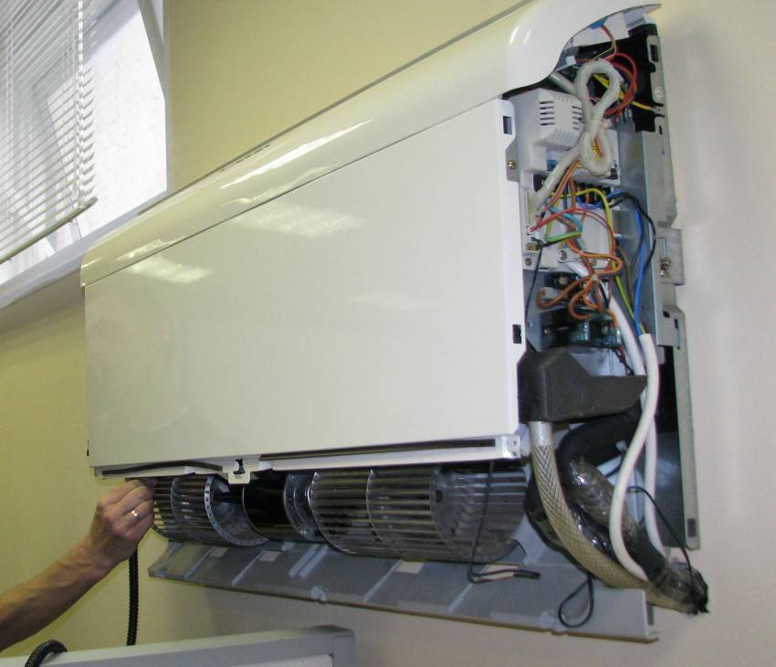 Если же расчёт будет проведёт неверно, а внутренний блок будет установлен неправильно, то накапливающийся в нём конденсат не будет выходить в трубу, а будет стекать прямиком на пол, поэтому следует очень серьёзно отнестись к процедуре крепления внутреннего блока к монтажной пластине, и желательно попрактиковаться перед этим.