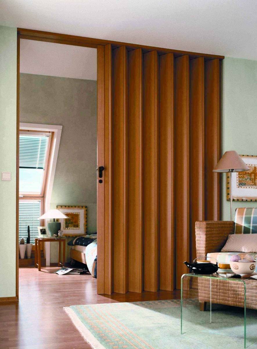 Складные. Это многостворочные модели, которые двигаются в определенном направлении. Конструкция этих дверей довольно сложная поскольку створки разделяются подгруппами – так называемыми гармошками.