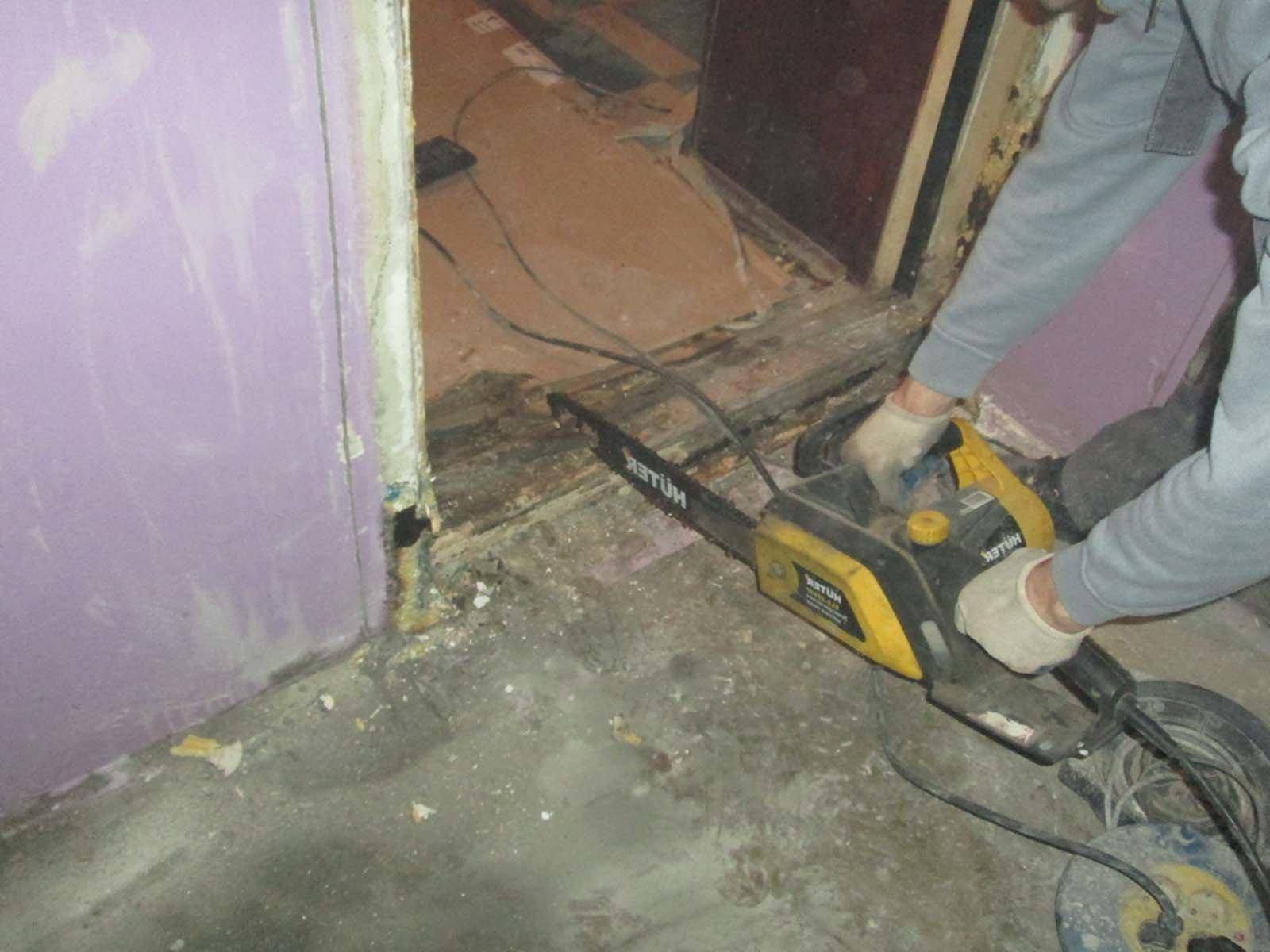 ШАГ 2: порог. Монтаж входных дверей осуществляется в полностью очищенный дверной проем. Прежде чем начинать извлекать лутку – необходимо избавится от старого порога. Для удобства демонтажа порога – разрезаем его ножовкой на две части и выбиваем его чем-то тяжелым. Если под рукой имеется молот – то сделать это можно за 1 – 2 удара.
