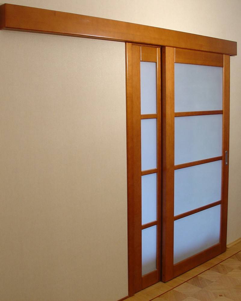 Раздвижные. Отличаться самым большим выбором модификаций. Могут иметь одну или две створки, которые будут открываться внутрь стены или же вдоль неё. Также бывают левосторонние и правосторонние.