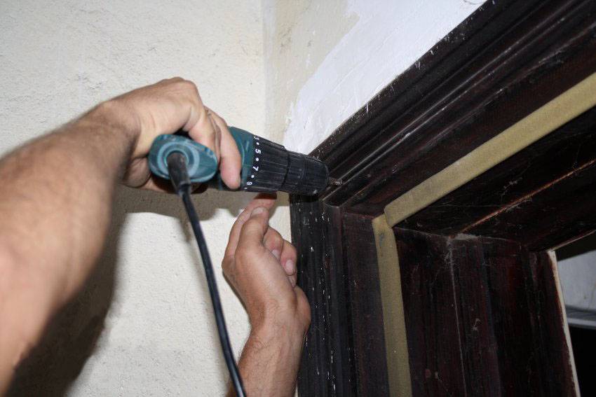 Через день можно снимать защитную пленку и оклеенную ранее малярную ленту. Останется только при необходимости навесить наличники с внешней стороны дверного проема. На деревянную дверь они прикручиваются саморезами с потаенной головкой. Для надежности и безопасности лучше головки саморезов утопить в дерево наличников и замазать с помощью шпаклевки по дереву.