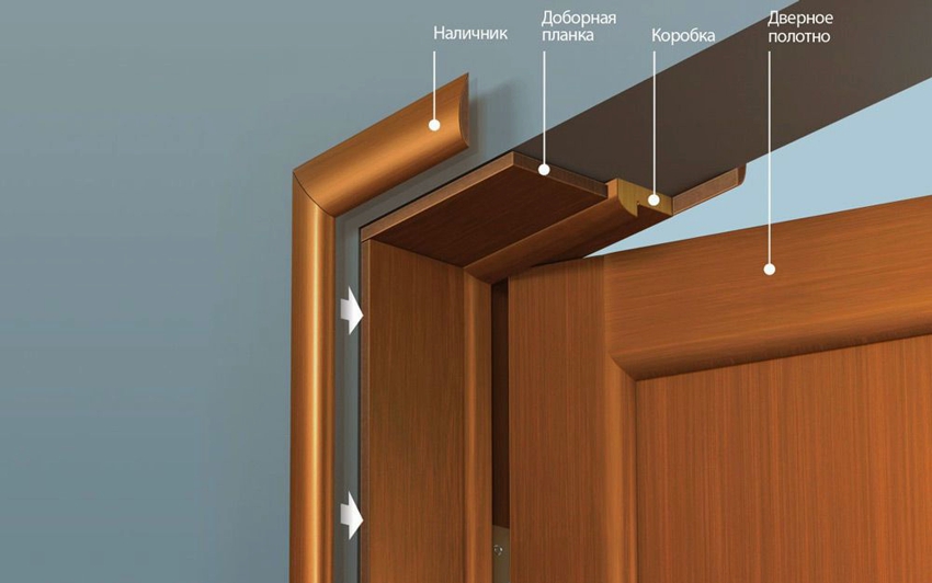Иными словами, одна часть заходит внутрь другой. Таким образом, для того чтобы установить такие изделия достаточно лишь отпилить излишки и состыковать детали. Выступ элемента заводится в углубление в дверном коробе. Затем необходимо выставить необходимое расстояние, которое регулируется размером углубления.
