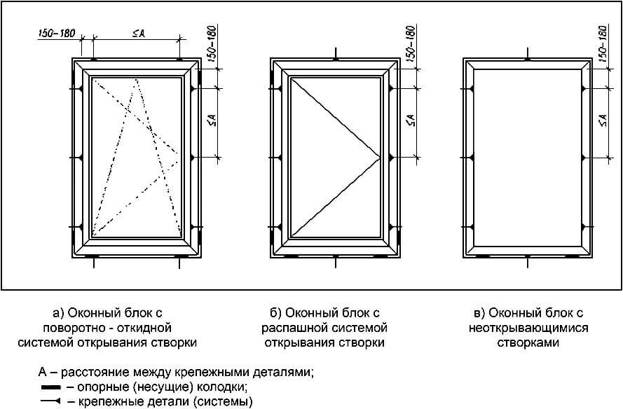 Расстояние от внутреннего угла коробки до крепежного элемента не должно превышать 150-180 мм; от узла импостного соединения до крепежного элемента — 120-180 мм.